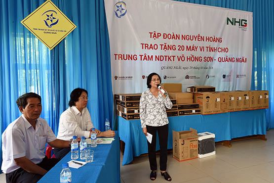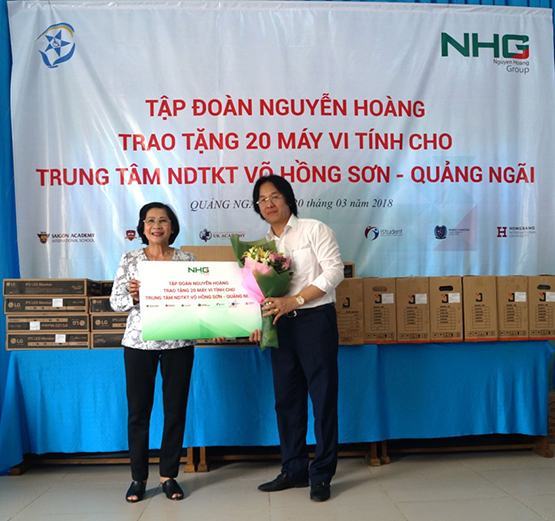 Ngày 20-3, Tập đoàn Nguyễn Hoàng (NHG) đã tổ chức trao tặng 20 chiếc máy tính cho Trung tâm nuôi dạy trẻ khuyết tật Võ Hồng Sơn ở thôn Phú Vinh Tây, thị trấn Chợ Chùa, huyện Nghĩa Hành (tỉnh Quảng Ngãi). Trung tâm nuôi dạy trẻ khuyết tật Võ Hồng Sơn do bà Nguyễn Thị Thu Hà (nguyên Ủy viên Trung ương Đảng, Phó Bí thư Thành ủy TP.HCM) sáng lập. Đi vào hoạt động từ tháng 8-2015, hiện nay trung tâm có đội ngũ 20 giáo viên và nhân viên, đang nuôi dạy 131 trẻ khuyết tật có hoàn cảnh khó khăn trên địa bàn tỉnh Quảng Ngãi. Ngoài việc dạy văn hóa từ tiểu học đến THCS theo chương trình chuyên biệt, trung tâm còn dạy thêm cho các em một số kỹ năng nghề nghiệp như may, thêu, làm hoa, tin học, photoshop… Thời gian qua, mặc dù đã nhận được nhiều sự quan tâm từ các ban/ngành nhưng Trung tâm nuôi dạy trẻ khuyết tật Võ Hồng Sơn vẫn còn gặp nhiều khó khăn. Việc NHG trao tặng 20 máy tính sẽ giúp trung tâm có thêm trang thiết bị giảng dạy để hoạt động bền vững, đồng thời giúp cho các em nhỏ không may mắn có điều kiện tiếp cận với công nghệ thông tin, mở mang tri thức.