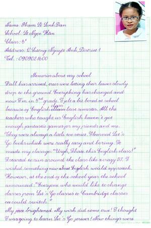Mùa thu đã tới, những chiếc lá rời cành rơi xuống. Nhiều thứ đã thay đổi và bây giờ em đã lên lớp 3. Em thấy hơi buồn và có cảm giác chán chán khi nghĩ đến những giờ học tiếng Anh trong năm học trước. Chẳng có giờ học tiếng Anh nào có những trò chơi lôi cuốn cho đám bạn chúng em. Bộ sách Let’s go em đã học ở trường sao mà dễ dàng và chán đến thế. Nó làm cho cả lớp em phải thốt lên: “Tụi mình không thích cứ phải học như thế này”. Em nhớ là mình đã chạy lòng vòng nhiều lần xung quanh lớp sau những giờ học Anh văn. Em mong chờ một sự thay đổi, một điều gì đó mới mẻ hơn. Thế rồi điều em mong đợi cuối cùng cũng đã đến, nhà trường có thông báo là: “Những học sinh nào muốn đổi sang học chương trình Cambridge thì có thể đăng ký”.
