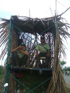 Sao không dựng kiên cố hơn? Tôi hỏi. Anh Thảo trả lời như cố ý khoe: “Cái này là “sáng kiến” của anh em, mượn được giàn giáo và tự thiết kế chứ có ai làm cho mình đâu. Trước đây, công trình chỉ cho mượn chiếc ghế và tấm bạt để phòng lúc nắng, mưa. Có “vọng gác” rồi đỡ nhiều lắm”.