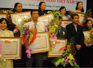 Phó chủ tịch UBND TP Hứa Ngọc Thuận (hàng trước, thứ hai từ phải) chúc mừng các giáo viên được phong tặng NGƯT trong năm 2010. Ảnh: Q.Huy