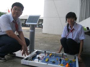 Trong khi đó, sản phẩm của hai em Hiếu Nghĩa – Kim Cương (Trường THCS Hưng Phú A) chỉ mới dừng lại ở mô hình, nhưng ý tưởng sử dụng năng lượng mặt trời để thắp sáng đèn tín hiệu giao thông là một ý tưởng táo bạo. “Mô hình của chúng em dùng pin mặt trời tạo ra các dòng điện giúp các thiết bị giao thông như đèn đường hay tín hiệu điều khiển hoạt động liên tục, không còn tình trạng thiếu hụt điện năng. Ban ngày hệ thống đèn giao thông sẽ sử dụng ánh sáng mặt trời, ban đêm sử dụng điện tích trữ từ bình ắc quy”, Kim Cương cho biết vậy. Hiếu Nghĩa cho biết thêm, nếu được “hiện thực hóa” mô hình này, bạn sẽ chọn trung tâm thành phố là nơi thử nghiệm đầu tiên, vì “nếu mất điện, đèn giao thông bị tắt thì trung tâm thành phố là nơi bị ảnh hưởng nặng nhất”. Trước câu hỏi khá “sốc” từ Ban giám khảo: “Nếu ứng dụng mô hình này vào thực tế, chi phí ban đầu sẽ rất tốn kém”, Kim Cương – đại diện nhóm – đã trả lời rất thông minh: “Sử dụng pin năng lượng mặt trời tuy ban đầu rất tốn kém, nhưng về lâu dài sẽ vừa tiết kiệm điện vừa hiệu quả trong việc bảo vệ môi trường. Mà môi trường thì không thể mua được bằng tiền”.