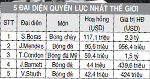 Siêu cò Jorge Mendes hóa ra chưa phải người đại diện quyền lực nhất. Tay cò người Bồ Đào Nha đang đại diện cho các ngôi sao như Cristiano Ronaldo, Angel di Maria, David de Gea và Radamel Falcao mới “chỉ” thu về tổng cộng 95,6 triệu USD tiền hoa hồng. Và tổng giá trị các bản hợp đồng còn hiệu lực do Mendes (thông qua công ty Gestifute của ông) môi giới mới “chỉ” đạt 956,4 triệu USD.