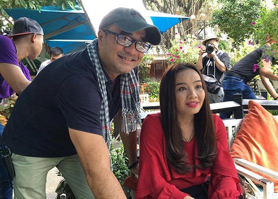 Đạo diễn Nhâm Minh Hiền (trái) cùng diễn viên Hoài An trên phim trường Những khúc sông dậy sóng