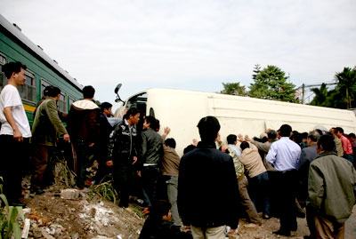 Mọi người xúm lại để lật chiếc xe bị tàu hỏa đâm.