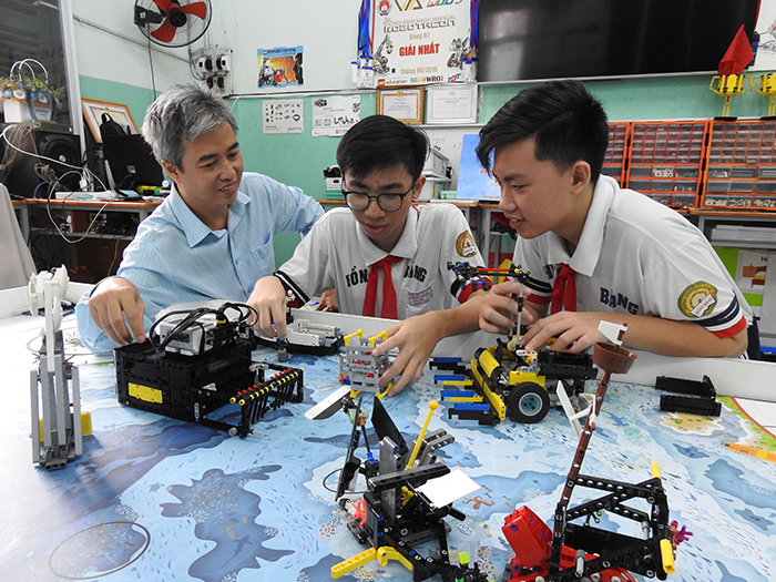 Thầy Hoàng Đăng Quang cùng các em học sinh luyện tập và thử nghiệm robot