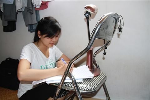 | Không có bàn học, Diệu học bài trên ghế ngồi. Ảnh: Trường Phong . |