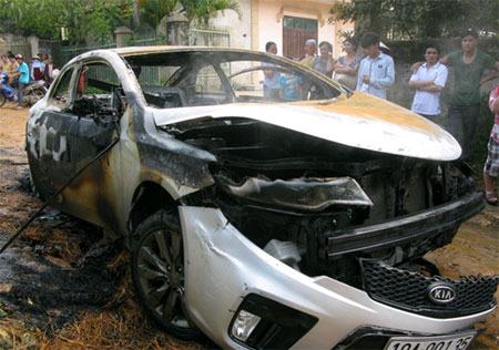 Chiếc xe ô tô hiệu Kia đang chạy trên đường tự nhiên bốc cháy dữ dội, xe bị cháy rụi, thiệt hại ước tính gần 700 triệu đồng.