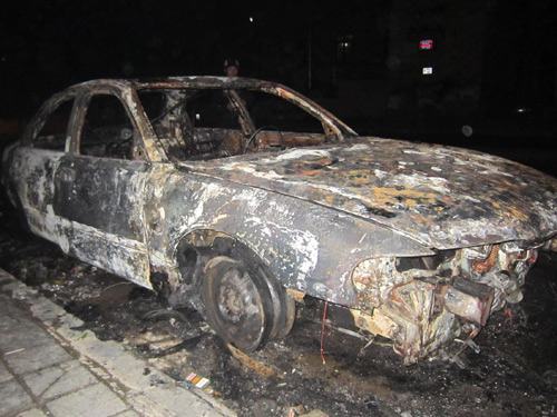 ![]() Chiếc xe Mazda bỗng nhiên bốc cháy, còn trơ lại phần khung sắt |