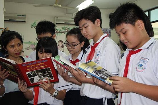 Học sinh Trường THCS Nguyễn Du (Q.1) học môn văn tại thư viện trường. Ảnh: Q.Long