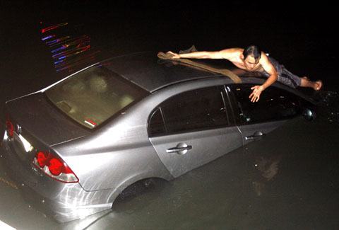 May mắn, mặt nước dưới kênh cạn nên tài xế kịp thoát ra cửa và leo lên mui nhờ trợ giúp của mọi người.