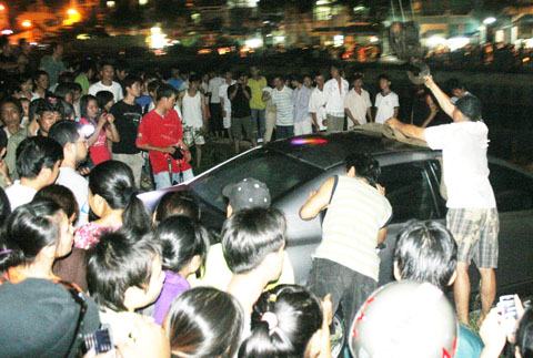 Đến 22h, sau hai giờ nằm dưới dòng nước đen và thối, chiếc ôtô 4 chỗ lâm nạn mới được đưa lên bờ, trong sự vây quanh của đám đông.