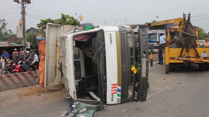 Xe ben lật ngang trên quốc lộ 1.