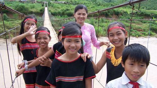 Cô trò ở ngôi làng “đu dây đến trường” qua sông Pôkô trên cây cầu mới đi dự khai giảng – Ảnh: T.T.NHI
