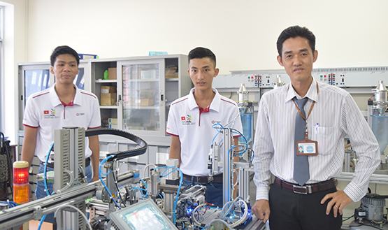 | Thí sinh và chuyên gia nghề cơ điện tử của Trường TC nghề kỹ thuật công nghệ Hùng Vương trước ngày đi thi tay nghề thế giới lần thứ 44 năm 2017 |