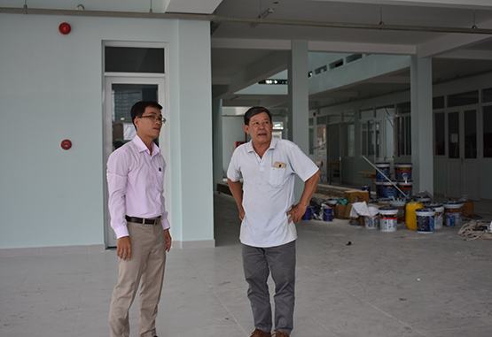 | Ông Lê Đình Thảo – Hiệu trưởng Trường THCS Cửu Long, Q.Bình Thạnh (bìa trái) cùng các chủ đầu tư công trình đang bàn bạc, gấp rút hoàn thiện công trình để kịp đưa trường vào sử dụng trong năm học mới 2018-2019 |
