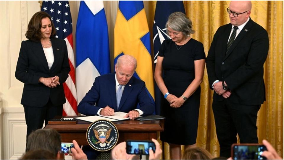 Tổng thống Joe Biden ký văn kiện phê chuẩn Phần Lan và Thụy Điển gia nhập NATO trước sự chứng kiến của Phó Tổng thống Kamala Harris và các Đại sứ Thụy Điển, Phần Lan.