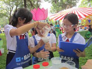 Các em học sinh tiểu học đang thực hiện thí nghiệm tại một cuộc thi khoa học. Ảnh: N.Trinh