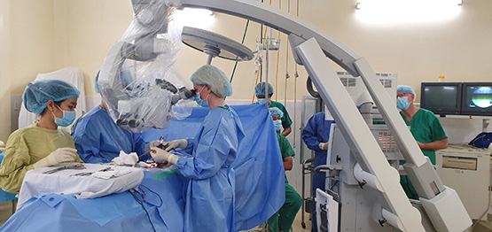 Bệnh nhân N.H.C (ngụ TP.Biên Hòa, tỉnh Đồng Nai) được chẩn đoán thoát vị đĩa đệm 2 tầng, hẹp ống sống thắt lưng đã 3 năm. Ê-kíp BS cùng các chuyên gia đã thực hiện phương pháp mổ giá ép lấy nhân nhầy bằng hệ thống hiện đại, sử dụng kính hiển vi Pentero 900 kết hợp với bộ dụng cụ vi phẫu và bàn mổ mới. Sau 2 giờ, ca phẫu thuật đã thành công, sức khỏe bệnh nhân hồi phục tốt.