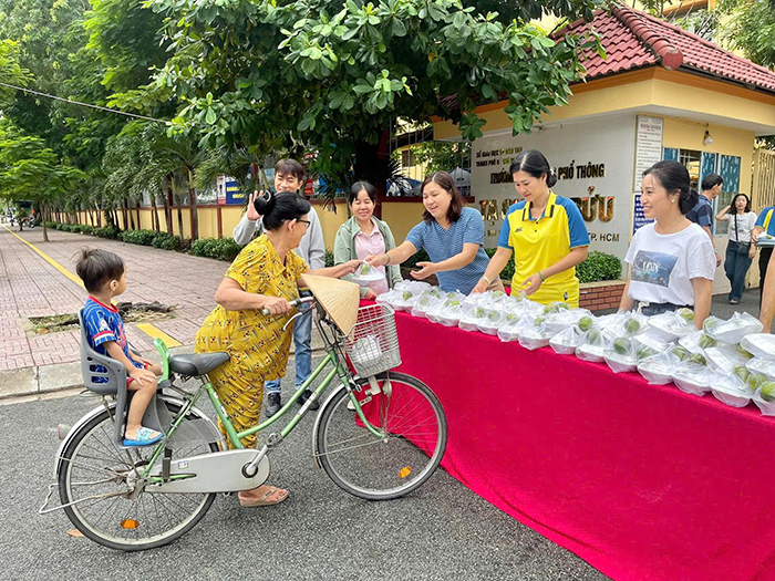 Bên cạnh chợ phiên “không đồng”, tập thể cán bộ, giáo viên, nhân viên, học sinh và phụ huynh Trường THPT Tạ Quang Bửu còn chung tay nấu các suất ăn gửi đến người dân khó khăn.