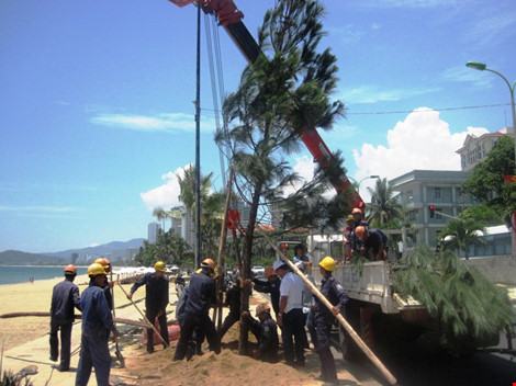 Trưa 27-8, công nhân của Công ty CP Môi trường và Đô thị Nha Trang (Khánh Hòa) đã triển khai trồng 25 cây thông có hình dáng rất đẹp dọc phía đông đường Trần Phú, đoạn ven biển trước UBND tỉnh đến Công viên Yến Phi.