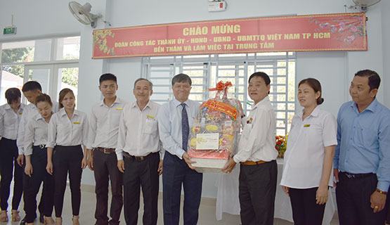 Thay mặt đoàn, Phó Giám đốc Sở GD-ĐT TP Nguyễn Văn Hiếu tặng quà cho Trung tâm Điều dưỡng người bệnh tâm thần. Ảnh: N.Trinh