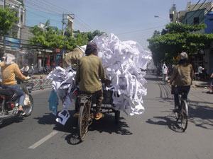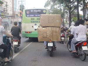 Một chủ xe ba gác vận chuyển giấy các tông thuê khi lưu thông trên đường Lý Thái Tổ (quận 10) thỉnh thoảng lại phải nhướng người lên để dò đường vì hàng chở thuê được chất cao hơn nhiều so với tầm nhìn