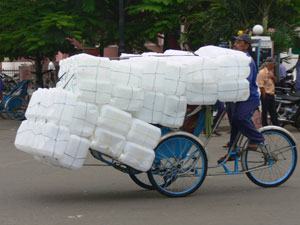 Chủ xe này cũng phải vất vả dò đường đi vì vận chuyển 100 cái can nhựa trên một chiếc xe xích lô. Hàng hóa tuy nhẹ tênh, nhưng quá cồng kềnh khiến ông khó quan sát