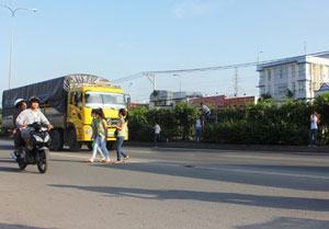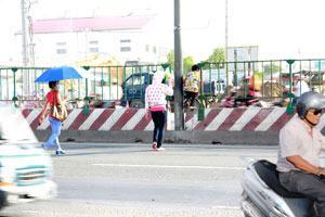 Con lươn ngăn cách cũng không ngăn được người đi bộ (gồm sinh viên, công nhân) ở khu cầu vượt Sóng Thần – quận Thủ Đức