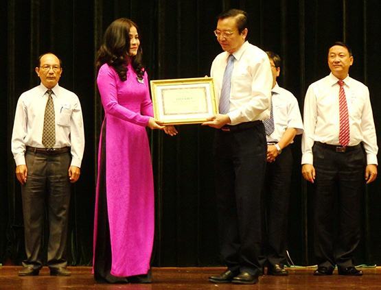 TS. Lê Hồng Sơn –  Giám đốc Sở GD-ĐT TP – trao giấy khen cho TS. Lê Thị Bình (Trưởng phòng GD-Đ T quận 1)