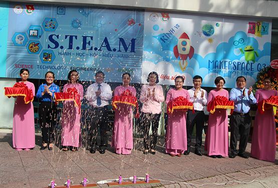 Các vị đại biểu cắt băng khánh thành Phòng STEM Quận 3