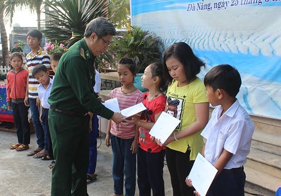 | Đại tá Nguyễn Hải, Phó Chính ủy BĐBP Đà Nẵng tặng quà cho HS có hoàn cảnh khó khăn tại lễ phát động. Ảnh: V.Yên |
