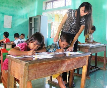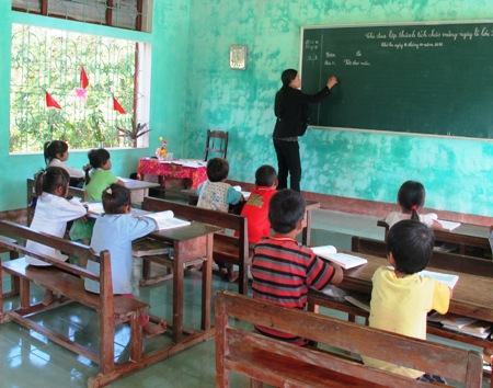 Để tận mắt chứng kiến sự khó khăn trong công tác dạy và học nơi đây, chúng tôi đã có mặt tại điểm trường Rào Đá. Hiện điểm trường Rào Đá có 6 giáo viên (GV) cắm bản dạy chữ. Điều kiện cơ sở vật chất trường còn nhiều thiếu thốn, chưa có đầy đủ phòng học nên 2 lớp phải học chung trong một phòng. Các thầy cô ở đây thường hay ví von: lớp học “2 trong 1”, và GV cũng phải dạy luôn 2 lớp. Gọi là lớp, nhưng thực chất mỗi lớp cũng chỉ có từ 4 đến 10 em, trung bình mỗi GV phụ trách dạy 5 em. Trao đổi với chúng tôi, thầy Nguyễn Duy Xuân, dạy lớp ghép 4 – 5, than phiền: Do phải dạy kèm một lúc 2 lớp trong một phòng nên GV gặp rất nhiều khó khăn. Dạy xong lớp này phải quay sang ra bài tập, rồi hướng dẫn cho lớp kia làm. Phòng học được kê 2 cái bảng ở 2 đầu với 2 chương trình khác nhau nên các em bị mất tập trung. Hơn nữa, HS ở đây chủ yếu là con em đồng bào dân tộc Vân Kiều nên bắt buộc GV phải biết chữ Vân Kiều thì học trò mới hiểu bài. Chính vì thế, chất lượng học tập của các em ít nhiều bị ảnh hưởng.