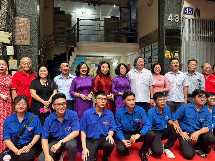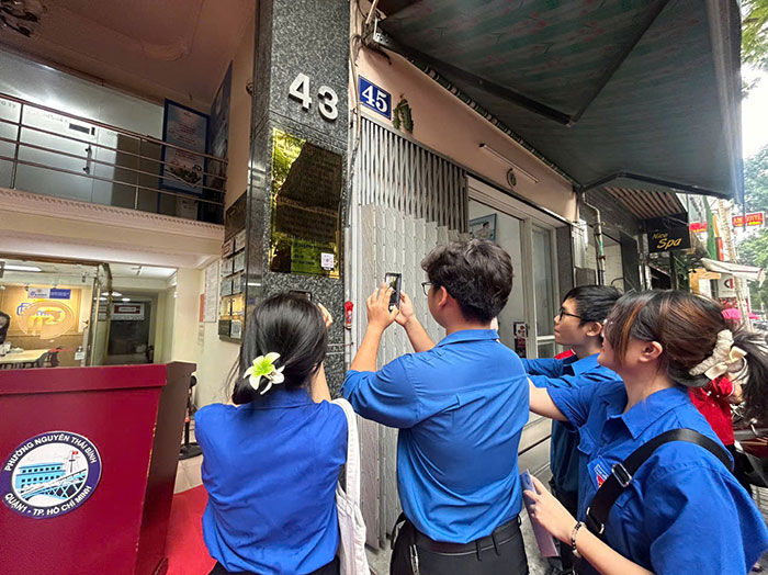 Đoàn viên thanh niên chụp ảnh bảng hiệu di tích lịch sử cấp quốc gia trụ sở Báo Dân chúng để tuyên truyền cho các bạn trẻ