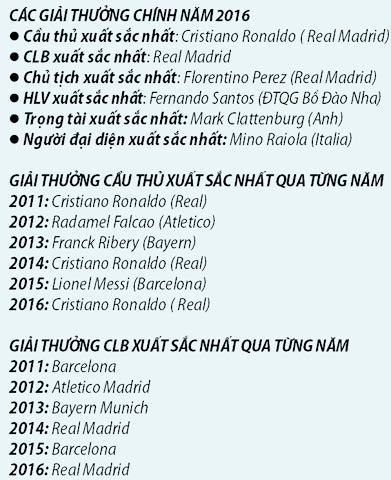 Như vậy, Real của năm 2016 đã tái hiện thành tích huy hoàng mà họ đạt được trong năm 2014. Như đã biết cách đây 2 năm, Real vô địch Champions League, Siêu Cúp châu Âu và FIFA Club World Cup. Ronaldo cũng đoạt Quả bóng vàng 2014. Tại lễ trao giải Globe Soccer Awards 2014, Real cũng đứng đầu ở 3 hạng mục quan trọng dành cho CLB, cầu thủ và HLV.