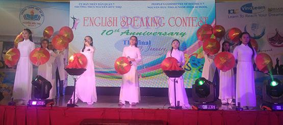 Vừa qua, Trường THCS Nguyễn Hữu Thọ (Q.7, TP.HCM) đã tổ chức vòng chung kết cuộc thi The English Speaking contest  2019, có 26 tiết mục tham gia ở 3 thể loại music, fashion và acting. Cô Trần Thúy Diệp (Tổ trưởng bộ môn tiếng Anh) cho biết đây là những tiết mục đặc sắc được đánh giá cao ở vòng sơ tuyển theo từng khối. Cuộc thi là cơ hội giúp các em học sinh trau dồi kỹ năng giao tiếp như nghe – nói tiếng Anh, đặc biệt là tự tin và yêu thích bộ môn hơn. Ông Ngô Xuân Đông (Trưởng phòng GD-ĐT Q.7) cho biết Trường THCS Nguyễn Hữu Thọ là một trong những đơn vị đi đầu trong công tác đổi mới phương pháp giảng dạy, trong đó có bộ môn tiếng Anh. Với lợi thế có nhiều giáo viên người nước ngoài thỉnh giảng và chương trình học hiện đại, đặc biệt là các hình thức học tập hứng thú như ngoài giờ lên lớp, tích hợp, sân khấu hóa… đã giúp chất lượng học tiếng Anh hằng năm của trường nâng cao rõ rệt.