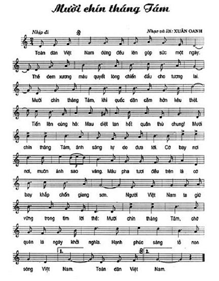 Trong những ngày này, có ý nghĩa nhất vẫn là ca khúc Mười chín tháng tám. Tên của tác phẩm không có gì cao xa, trừu tượng mà chính là mốc son vẻ vang của cách mạng buổi bình minh. Ra đời trong hoàn cảnh đặc biệt, bài hát lại càng có giá trị thời đại hơn khi nhạc sĩ chấp bút ngay trên đường tranh đấu. Không có giấy, chỉ là một vỏ bao thuốc lá nhưng từng nốt nhạc vẫn được thắp sáng trên từng câu chữ để ghi lại những khoảnh khắc đáng nhớ của sự kiện trong mùa thu lịch sử. Với bố cục chung mở đầu bằng lời kêu gọi: “Toàn dân Việt Nam đứng đều lên góp sức một ngày. Thề đem xương máu quyết đền cho tương lai”, khi được vang lên mọi người như thấy có cờ bay phấp phới rực ánh sao vàng cùng màu đỏ quyết đấu tranh. Dư âm vang vọng nhất vẫn là điệp khúc day dứt, rộn ràng và cả tự hào: “mười chín tháng tám ánh sao tự do đưa tới. Mười chín tháng tám chớ quên là ngày khởi nghĩa”. Đây cũng là lời nhắc nhở, dặn dò của lớp cha anh đi trước đối với hậu thế quý trọng hơn máu xương những người đã ngã. Không khí đấu tranh, phá kho thóc, giành chính quyền được thổi bùng từng câu chữ hun đúc thêm ý chí cách mạng. Ông Đỗ Tấn Huỳnh – một cựu tù Phú Quốc từng chia sẻ: “Mỗi lần nghe lại bài hát tôi như thấy mình trẻ lại và được trở về với những ngày cùng anh em theo đoàn quân giành lại chính quyền về tay nhân dân”. Tuy mắt mờ tay yếu, nhưng mỗi khi nghe qua radio bài hát này, ông vẫn hình dung được cảnh đoàn người từ trong máu lửa tốc lực xông lên như nước vỡ bờ dưới ngọn cờ đỏ bay phấp phới tưởng như không có gì ngăn cản được. Những ngày đó tin báo tiệp dồn về càng say lòng người tạo nên một “luồng điện tháng tám” mạnh hơn bao giờ hết: “Cờ bay lòng cũng bay. Người hát đường cũng hát. Già trẻ gái trai say”. (Xuân Diệu)