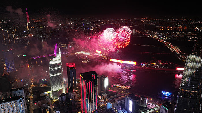Trên bầu trời TP, trước đường đi bộ Nguyễn Huệ, những màn trình diễn xếp hình bằng ánh sáng bởi công nghệ thiết bị bay không người lái (Drone) và pháo hoa nghệ thuật càng tăng thêm sức hấp dẫn cho chương trình.