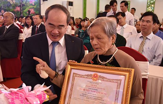 | Bí thư Thành ủy TP.HCM Nguyễn Thiện Nhân trao tặng danh hiệu BMVNAH cho mẹ Nguyễn Thị Xây. Ảnh: Q.H |