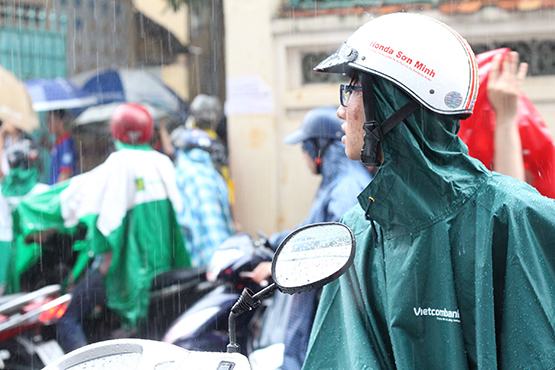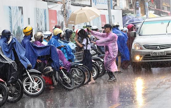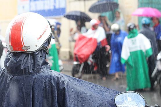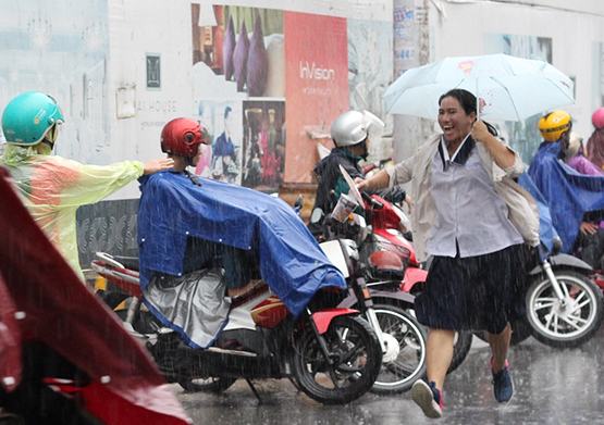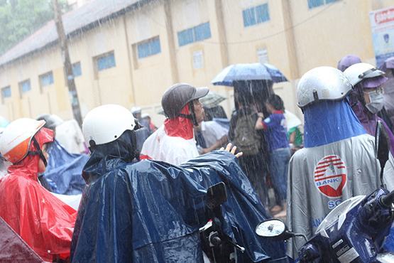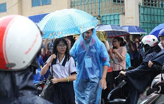 Tại TP.HCM, mưa lớn bất ngờ ngay thời điểm TS kết thúc giờ làm bài. Nhiều điểm thi, hàng chục dù, áo mưa được đội sinh viên tình nguyện tiếp sức mùa thi chuẩn bị sẵn, che chắn, đưa TS ra cổng.