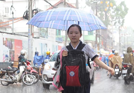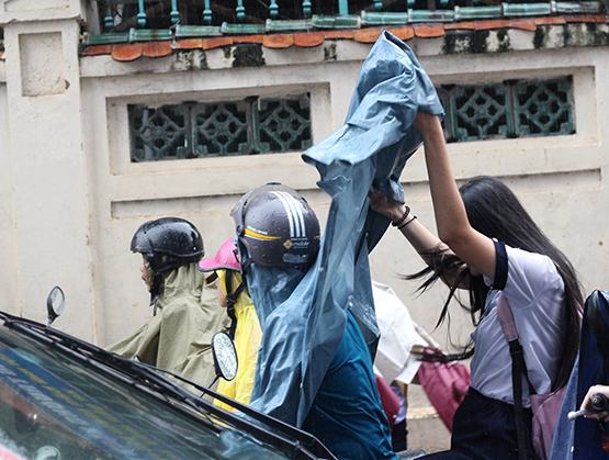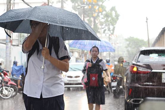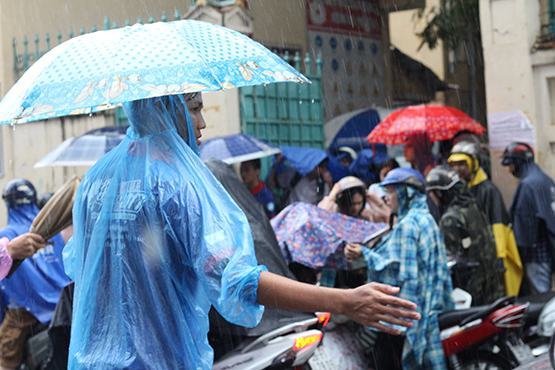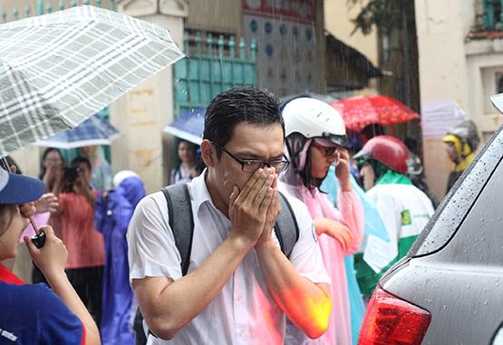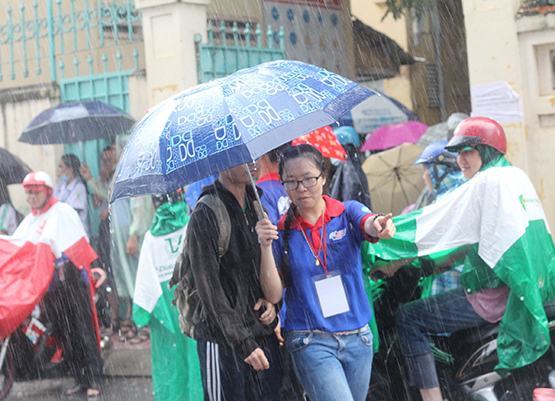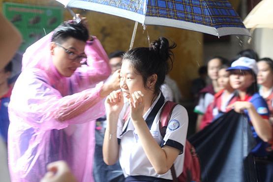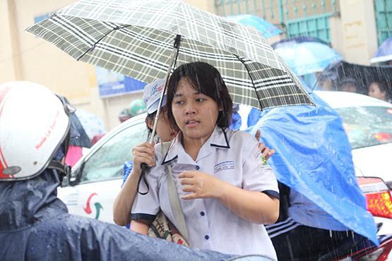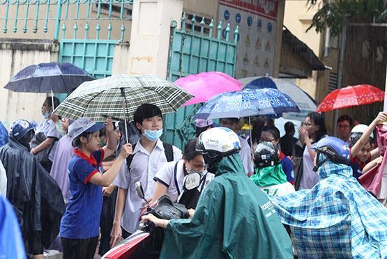 Ở điểm thi Trường THPT Nguyễn Thị Minh Khai, 10 phút trước khi hết giờ, sinh viên tình nguyện đã bung dù sẵn để sẵn sàng hỗ trợ TS. Vào đúng thời điểm hết giờ, TS rời phòng thi, mưa bất ngờ trút mạnh, nhiều sĩ tử lúng túng tìm cách ra về.