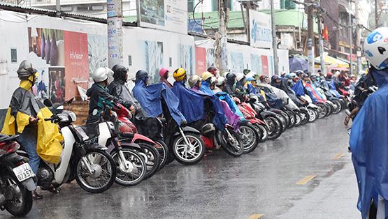 Phụ huynh mặc áo mưa xếp hàng dài đợi con trong cơn mưa lớn