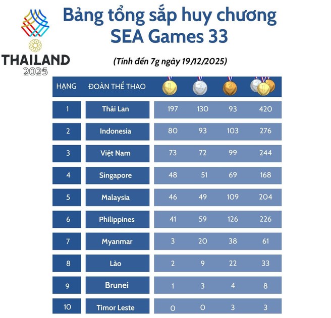 Kết thúc 9 ngày thi đấu chính thức, đoàn thể thao Việt Nam đã có được 73 HCV, 72 HCB và 99 HCĐ, tiếp tục đứng thứ 3 bảng tổng sắp huy chương SEA Games 33.