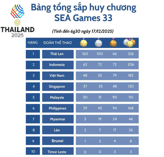 Bảng xếp hạng huy chương tính đến 21 giờ 30 ngày 16/12: