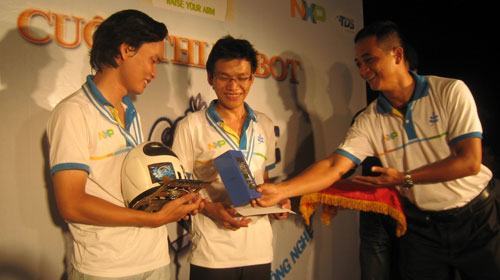 | Lê Phạm Ngọc Duy (bìa trái) và Võ Đăng Khoa (đội CGT) giành huy chương vàng trong cuộc thi – Ảnh: B.Thanh |