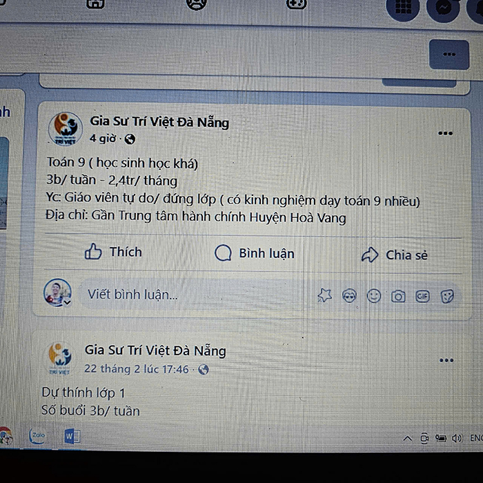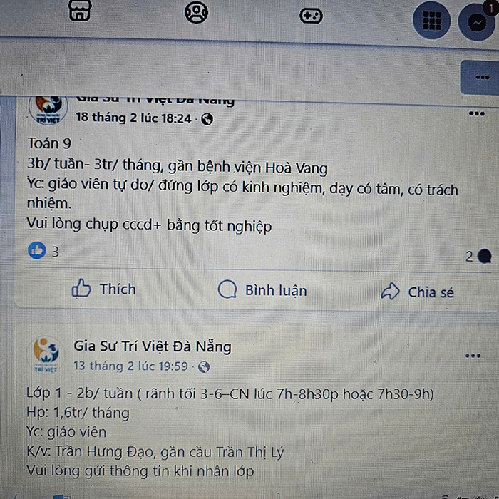 Những ngày gần đây, thầy L.Đ.T. – một giáo viên tự do có mở trung tâm dạy thêm môn vật lý (quận Hải Châu) đăng thông tin cần tuyển 4 sinh viên làm trợ giảng. Công việc chính của các trợ giảng này sẽ là hỗ trợ soạn giáo trình, tài liệu, bài kiểm tra, chấm bài dưới sự hướng dẫn của giáo viên. Ngoài ra, trợ giảng đảm nhận công việc giải đáp các thắc mắc của học sinh thông qua hình thức online trên nền tảng mạng xã hội một cách nhanh chóng và kịp thời nhất. Đăng thông tin cần tuyển khá rộng rãi nhưng thầy T. cho biết vẫn đang cân nhắc việc phỏng vấn, tuyển chọn sinh viên phù hợp. Sau khi tuyển hoàn thành các sinh viên trợ giảng, trung tâm sẽ thực hiện đầy đủ các yêu cầu quy định về thuế.