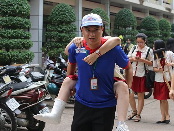 Sinh viên tình nguyện cõng thí sinh bị gãy chân lên phòng thi. Sáng 22-6, tại điểm thi Trường THPT Hàn Thuyên (TP.HCM), khi thấy thí sinh Phương Linh được gia đình đưa đến cổng với đôi chân bó bột và chống nạng đi khó khăn, bạn Trần Quang Trung (sinh viên năm 2 Khoa KHXH và NV, Trường ĐH Văn Hiến – là tình nguyện viên tiếp sức mùa thi tại điểm thi này) đã xông xáo cõng em lên tận phòng thi ở… lầu 3. Dù khá mệt nhưng Trung vẫn hào hứng chia sẻ: “Người bình thường leo nhiều bậc cầu thang đã hao tốn sức rồi, thí sinh bị gãy chân việc đi lại càng khó nhọc hơn, đó là chưa nói đến đau đớn. Đây là lý do tôi tình nguyện cõng giúp để em thoải mái tinh thần làm tốt bài thi”. Riêng thí sinh Phương Linh cũng cảm kích trước sự hỗ trợ tận tình của các anh chị sinh viên tình nguyện, càng quyết tâm làm bài thi thật tốt.
