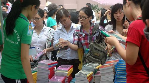 Trước cổng cơ sở 2 Trường ĐH Khoa học xã hội và nhân văn (ĐH Quốc gia TP.HCM), một băngrôn có chữ “Nhà sách sinh viên – đợt bán sách giảm giá” nhưng chỉ có vài cuốn giáo trình gốc, còn lại là các chồng sách “tái bản” cao ngút lúc nào cũng nhộn nhịp người mua bán. Nhân viên bán hàng ở đây cho biết những cuốn sách photo như pháp luật đại cương, nhân học đại cương, lịch sử văn minh thế giới… được bán với giá 20.000 đồng/cuốn, rẻ hơn 50% so với mua sách giá gốc.