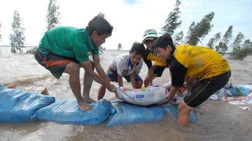 | Sinh viên khoa giáo dục thể chất và quản lý đất đai ĐH Đồng Tháp đang cứu đê |