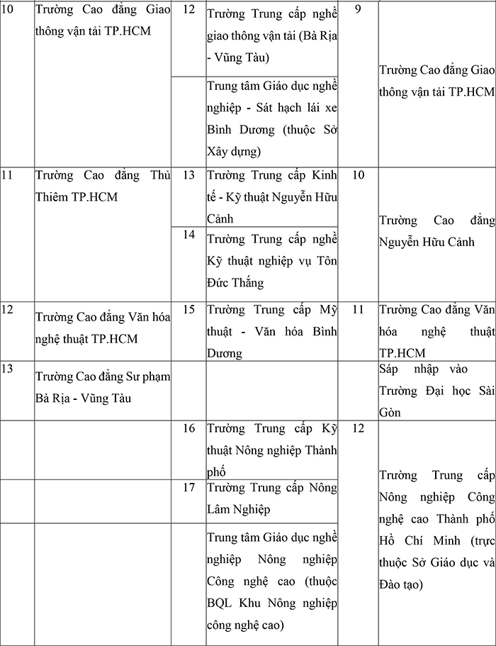 Giữ nguyên 6 trường cao đẳng: Trường Cao đẳng Việt Nam – Singapore; Trường Cao đẳng Việt Nam – Hàn Quốc Bình Dương; Trường Cao đẳng Kỹ thuật công nghệ Bà Rịa – Vũng Tàu; Trường Cao đẳng Công nghệ Thủ Đức; Trường Cao đẳng Kiến trúc – Xây dựng TP.HCM; Trường Cao đẳng Bán công Công nghệ và Quản trị doanh nghiệp.