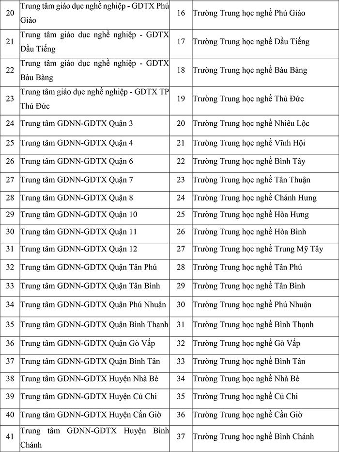 Không sắp xếp 2 trường do doanh nghiệp quản lý: Trường Trung cấp Du lịch – Khách sạn Saigontourist; Trường Trung cấp Suleco.